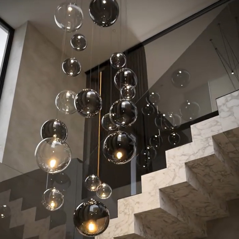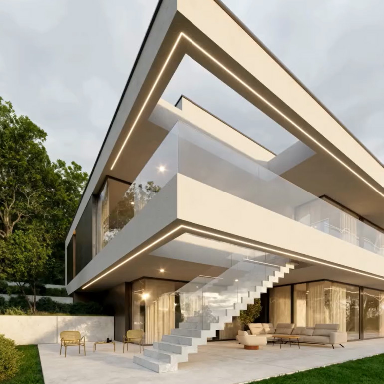 Když světlo tvaruje prostor. Vytváříme animaci pro náš nový návrh interiéru, kde hlavní roli hraje lomené okno přivádějící denní světlo ze střechy. Schodiště se stává architektonickým zážitkem i propojením pater v luxusní vile.